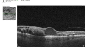 Following a degenerative process within the retina, a cavity or void may form where retinal tissue has been lost. These degenerative cavities lack the cellular components necessary to reflect light and thus appear as dark spaces on OCT. It’s important to differentiate these cavities from cystic spaces, which may have distinct clinical implications.