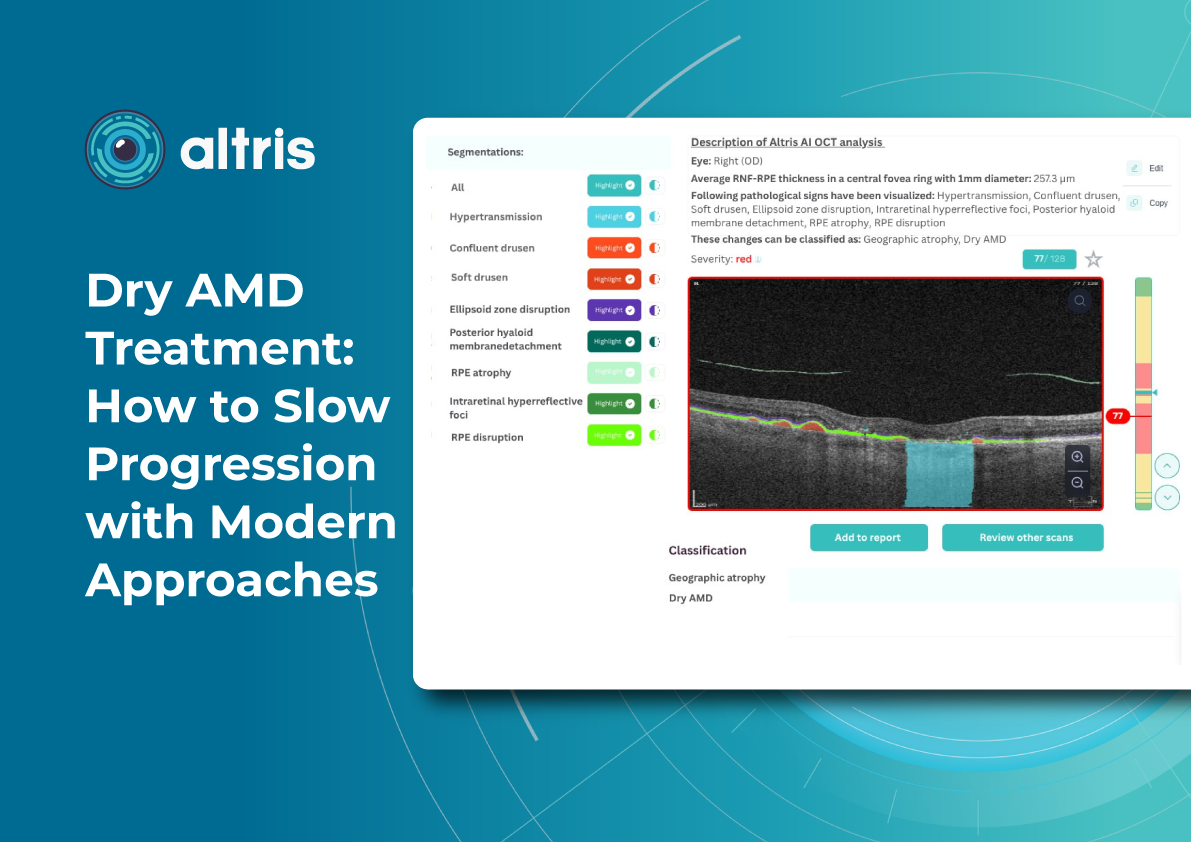 Fortunately, nowadays, there are a lot of ways to empower the clinical workflow, and AI blindness prevention tools are gaining popularity. Artificial intelligence systems like Altris AI can analyze retinal images and other diagnostic data to detect early signs of age-related eye diseases. Altris AI platform, for example, can detect 70+ pathologies and pathological signs, including the ones, that refer to age-related diseases.